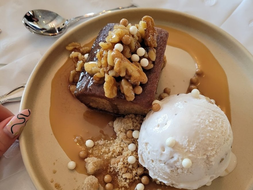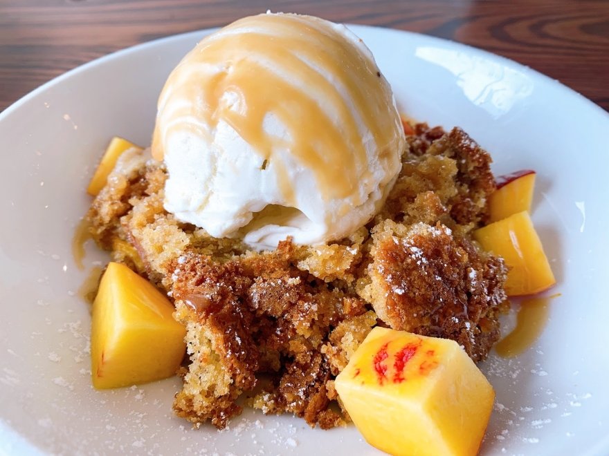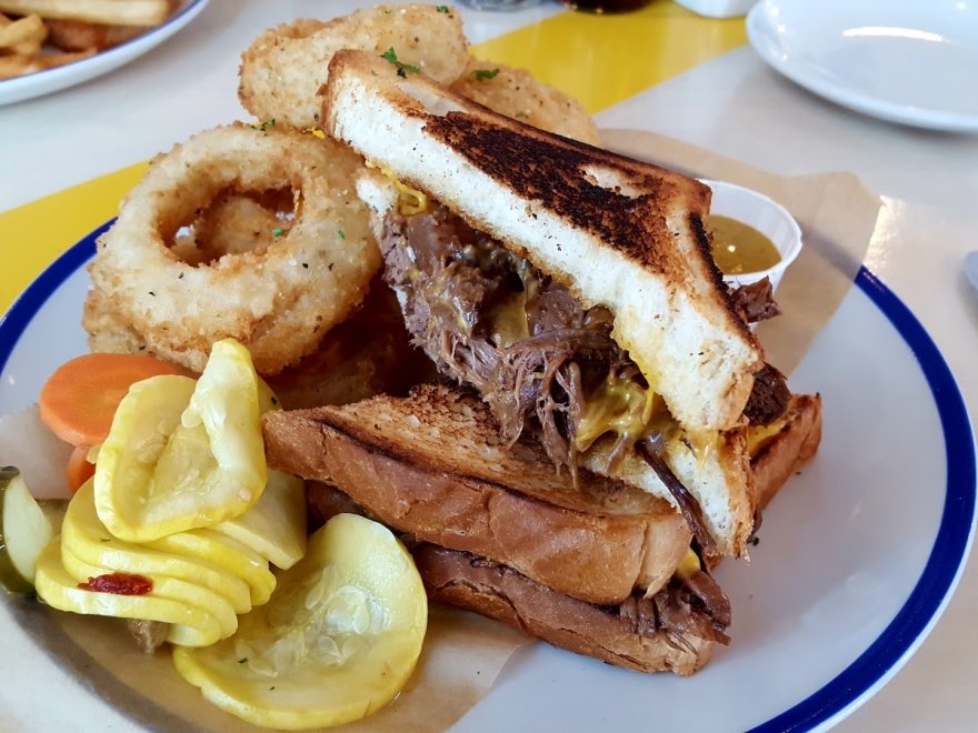 Ordered a draft Dewey Beer that was delicious, fruity and thirst quenching on a hot day. My husband and I shared a crab cheese dip with toasted baguette…served hot be careful, wow it was good. My husband had a double smashed burger with shoestring fries that he said was very good. I had a grilled cheese and crab on sourdough with fries and good pickled carrot and squash coins. The fries were good but when we spotted another diners onion rings we were a bit envious!